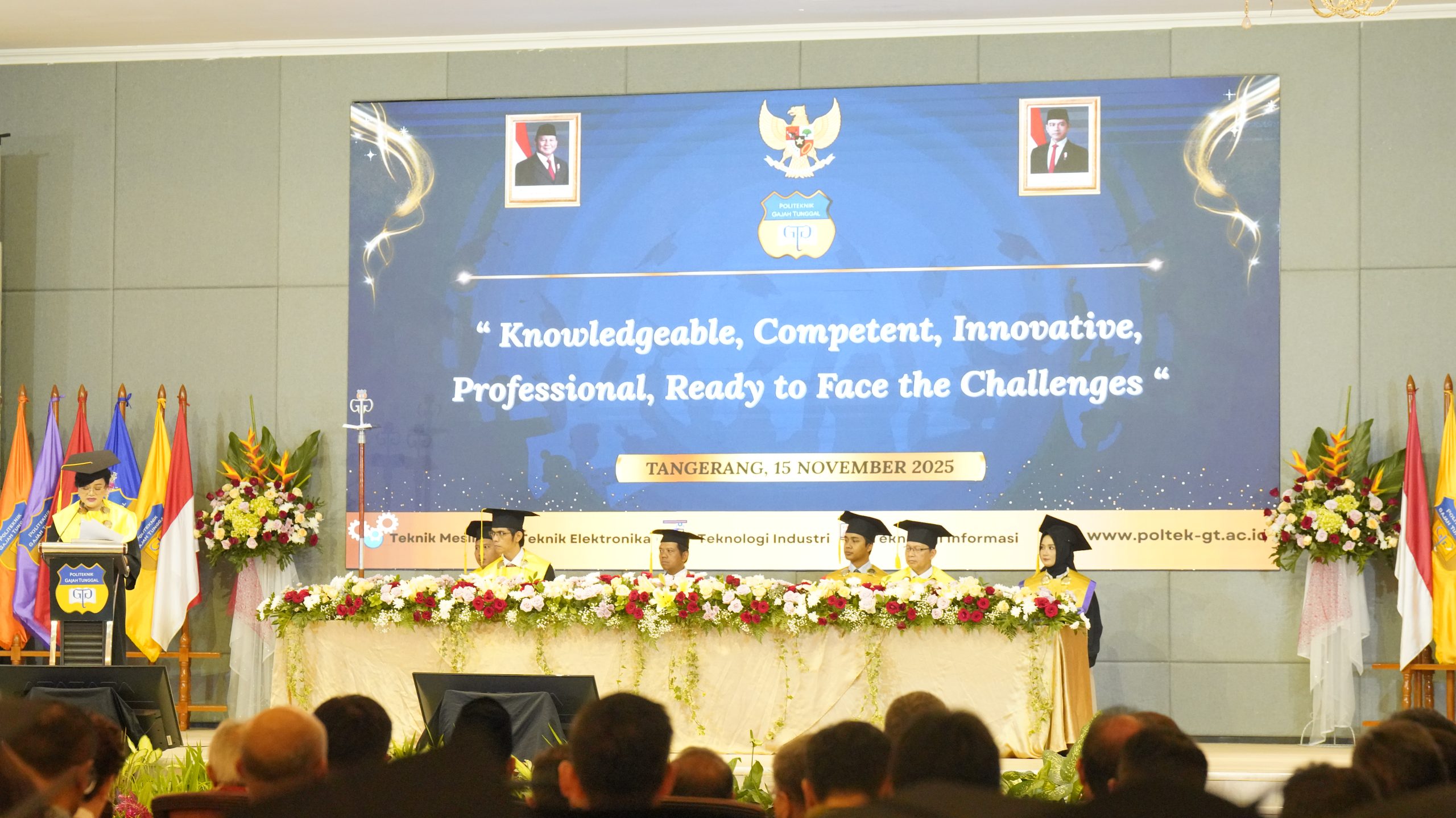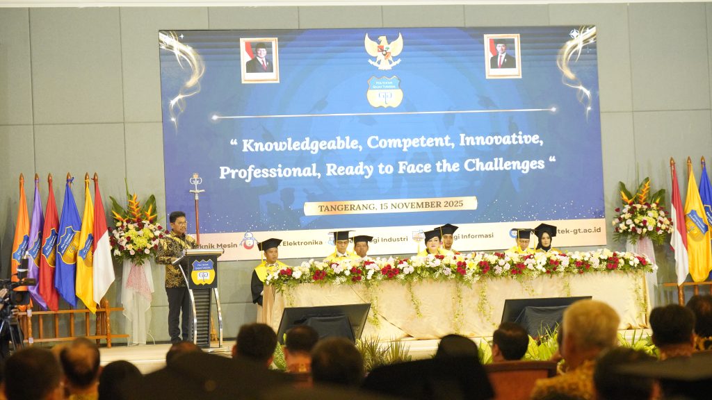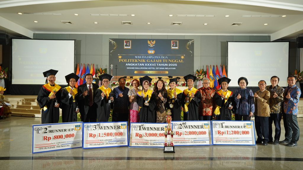 Tangerang, 15 November 2025 – Politeknik Gajah Tunggal menggelar Wisuda Diploma Tiga Angkatan 36 Tahun 2025 pada hari Sabtu, 15 November 2025 yang penuh sukacita di Ballroom Istana Nelayan. Acara yang berlangsung dengan khidmat ini menjadi momentum penting bagi para wisudawan sebagai penanda berakhirnya perjalanan akademik sekaligus awal dari babak baru dalam dunia profesional. Wisuda ini dihadiri oleh jajaran pimpinan Politeknik Gajah Tunggal, perwakilan PT Gajah Tunggal Tbk, para dosen, orang tua wisudawan, serta tamu undangan lainnya.
